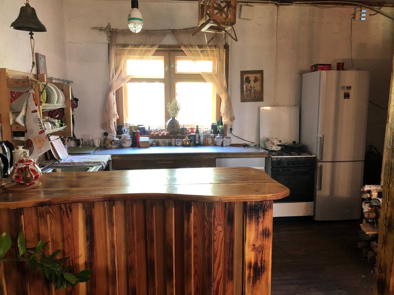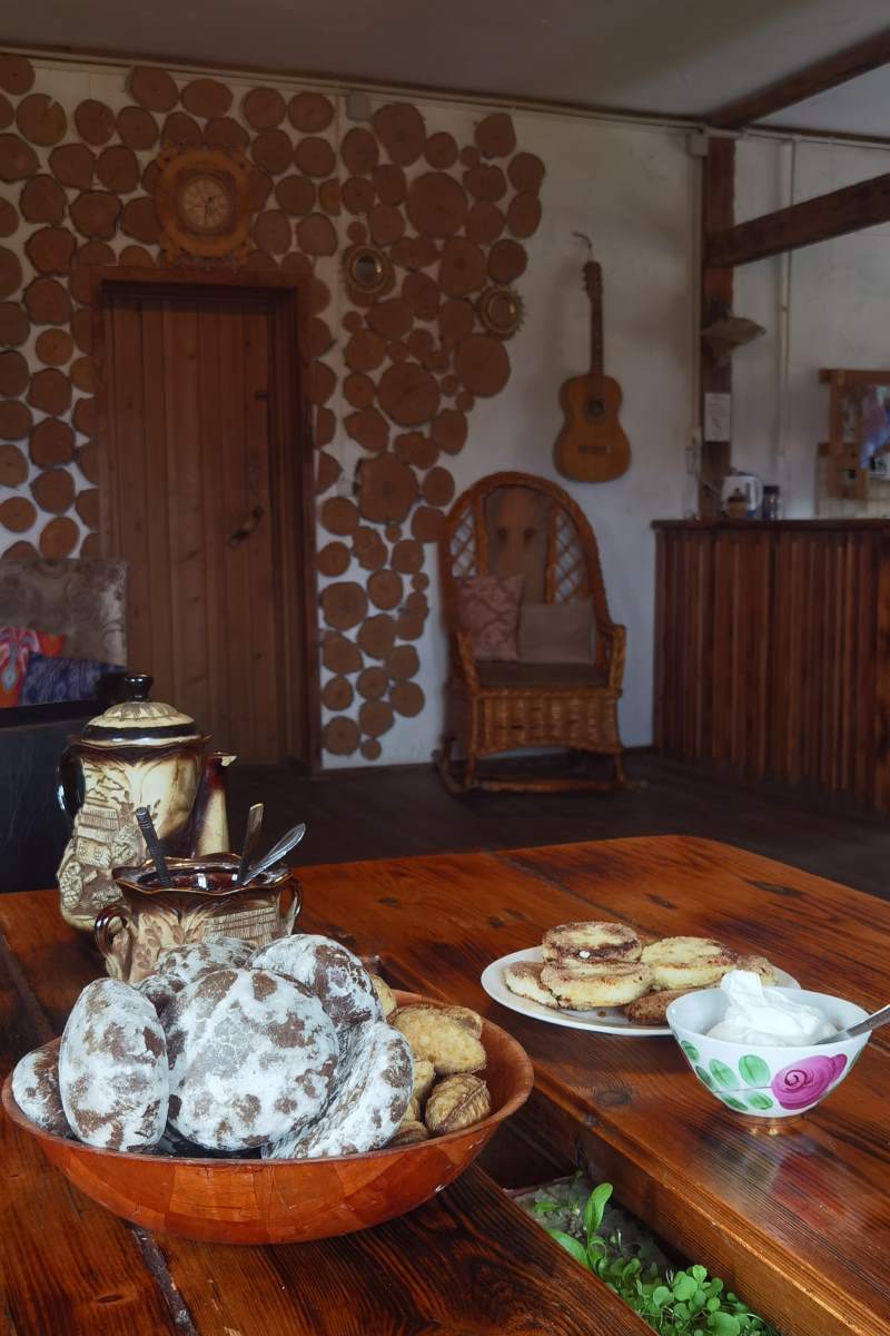 Кухня оборудована газовой плитой, рабочий стол для приготовления пищи, мойка (горяч, хол. вода), имеется вся посуда, сковороды, кастрюли, казан. Вы можете кулинарить сами или заказать домашний завтрак. Яичница из яркожёлтых яиц наших курочек очень нравится деткам! Блинчики на козьем молочке с чашечкой кофе под кроной берёз наполнят благостью весь день!